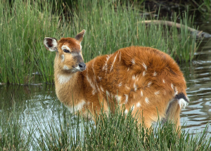 These animals are most active at dawn and dusk however can be active during both day and night. They feed on bulrushes, sedges and leaves of bushes sometimes venturing out of the swamp to graze on grasses in riverine forests. They are known to be Africa’s only true amphibious antelopes with many adaptations to their aquatic habitat. Sitatungas are also known to be strong but slow swimmers capable of paddling several miles. They can dive deeper if in danger staying hidden with only part of the head out of the water.